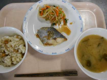 さわらは生姜と酒で下味をつけた後、でんぷんをまぶしてから油を軽く表面に塗り、オーブンで焼きました。油で揚げた時のようにカリッと焼きあがります。ソースに使った梅干しのクエン酸パワーで疲れをとりましょう。