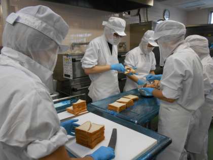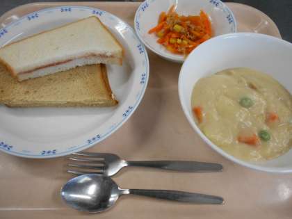 今日は栄養たっぷりのにんじんをサラダにしました。にんじんサラダは細く切った方がおいしいので、大変ですが、1時間半かけて包丁で千切りにしてもらいました。おかげ様でおいしい人参サラダができました。写真は2色サンドを作っているところです。