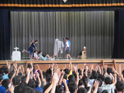 写真の通り、集会委員の名演技で会場は大盛り上がりでした。