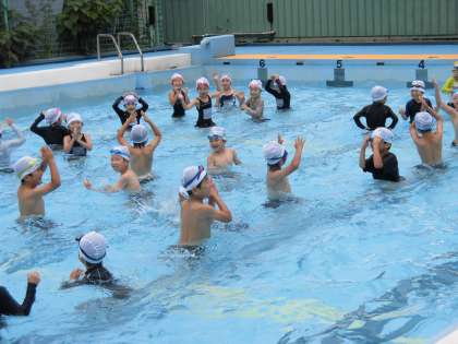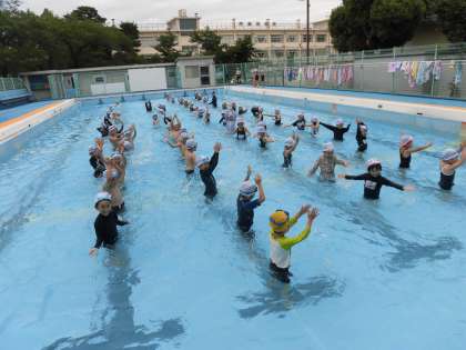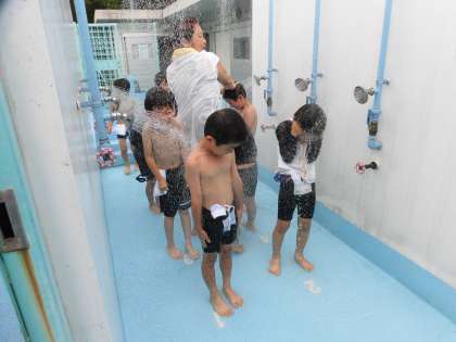 ようやく1年生もプール開きができました。シャワーの洗礼を受けたあと、初めての水慣れ。広いプールで水の感触を楽しんでいました。