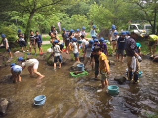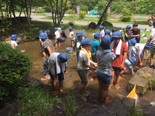 今日の夕食のおかずの一品となるマスのつかみ取りをしました。飯盒炊さんに合わせて、ビレッジの方に串焼きをお願いしてあります。
