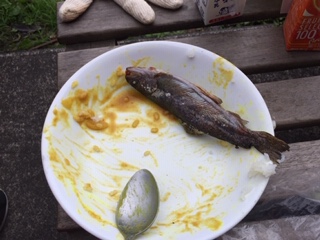 野外の空気がなによりのご馳走です。昼間つかまえたマスも美味しいです。