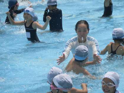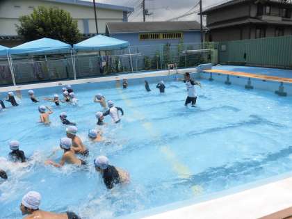 じゃんけん列車や、水中バナナおにも行いました。こうして徐々に水に慣れていきます。1,2年生にとって楽しいプールでのひとときでした。