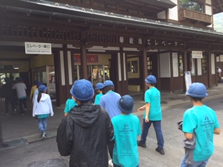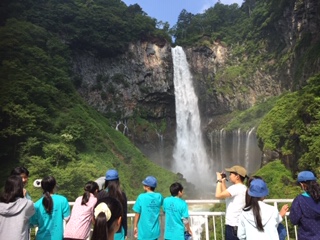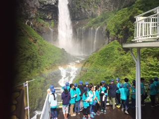 最初の見学地の華厳の滝です。エレベーターに乗って100メートル降りました。滝壺付近はシャワーのようで、綺麗な虹がかかっていました。