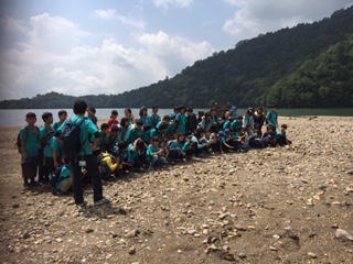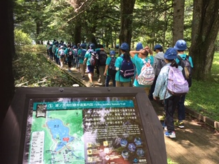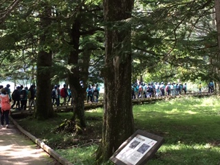 湯の湖畔で、集合写真を撮りました。これから湯の湖を半周して湯滝に向かいます。