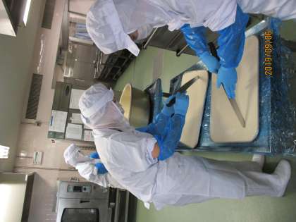 写真は給食室でつくった杏仁豆腐を、切っているところです。