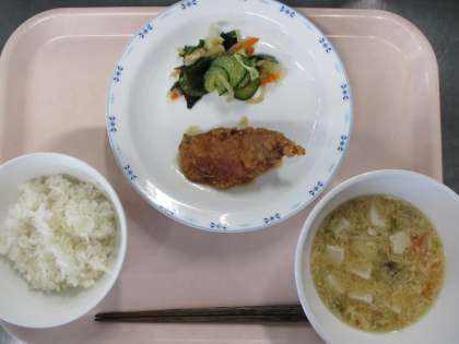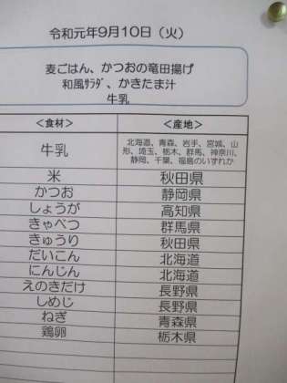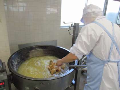かつおで、竜田揚げを作りました。かつおは春は初ガツオ、秋は戻りガツオとよばれ、秋の戻りガツオは脂がのっておいしくなります。写真はかつおを揚げた後、中心温度を確認しているところです。