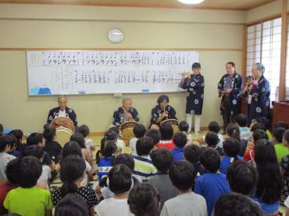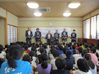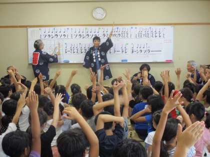 いよいよ今年も、3年生の石井戸囃子の練習が始まりました。安藤武夫さんはじめ石井戸囃子保存会の先生方に今日は6名もおいでいただきました。「練習中は口を閉じること」など、基本的な心構えを伺い、身が引き締まった3年生でした。楽器の紹介の後、保存会の方々の演奏を聞かせていただきました。締太鼓のたたき方を習い、最後に子どもたちが笛(リコーダー)で旋律を吹きました。夏休みの宿題として練習した甲斐あって、お褒め言葉をいただくことができました。11月3日の本番に向け、今年はどんな仕上がりになるでしょう。楽しみです。