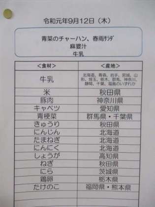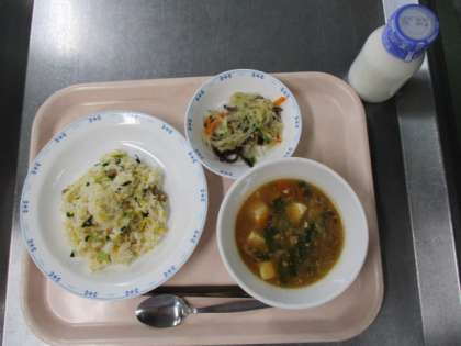 今日の青菜のチャーハンはチンゲン菜をたっぷり使って、給食室の大きな釜で炒めてつくりました。緑黄色野菜がおいしく食べられる献立です。暑いときでもつるっとした食感でおいしく食べられる春雨サラダ、少しピリッとするマーボー汁を合わせました。