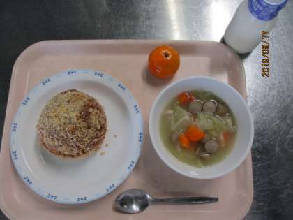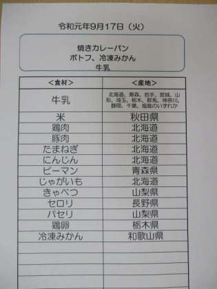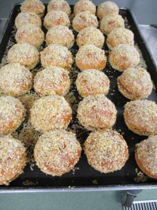 今日は焼きカレーパンを作りました。カレーミートを作った後にパンにはさみ、表面に卵をぬります。そこへパン粉とカレー粉を混ぜたものをしっかりとまぶしつけてから、オーブンで焼きます。表面がカリッと香ばしく焼けてとてもおいしいカレーパンができました。こどもたちにもとても好評でした。写真はカレーパンが焼きあがったところです。