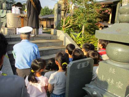 9月19日、秋の交通安全運動の期間に合わせて、交通安全祈願祭が行われました。成城警察、交通安全母の会、PTA校外委員会等の協力を得て、行いました。この付近は細いながらも交通量が多い道があったり、過去に大きな事故が起こっている世田谷通りが近所にあったりします。子どもたちの安全を願わずにはいられません。みんな、自分は事故に遭わないと思っているものです。警察署長さんから「信号が青でも、安全を確かめてからでないと渡ってはいけません。」とお話がありました。ご家庭でも道の歩き方や渡り方、そして、自転車の乗り方について、話題にしてみてください。