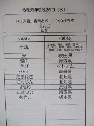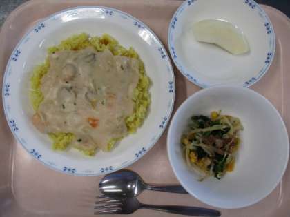 今日はカレー粉とバターで味付けしたごはんの上に、ホワイトソースかけていただく「ドリア風」です。ドリアといえば、オーブンで焼いたものが定番ですが給食では焼きません。あさり、えび、鶏肉のだしがよく出ていておいしいホワイトソースができました。
