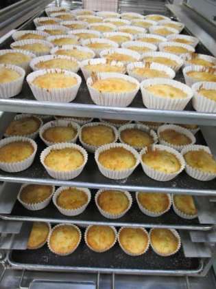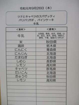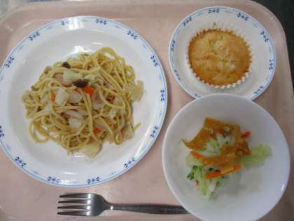 今日のスパゲッティは、キャベツとツナ、しめじを使った和風パスタです。にんにくがきいたしょうゆ味です。写真はパインケーキが焼きあがったところです。生地には、パイナップルの缶詰を刻んだものが入っています。表面にグラニュー糖をふりかけてから焼くことにより、パリッとした食感が楽しめます。このように給食のデザートは材料から手作りしています。