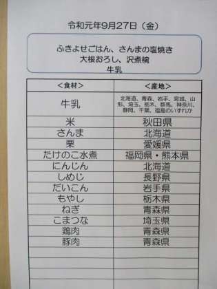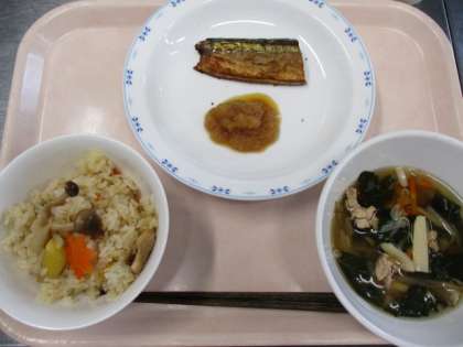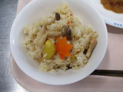 今日は秋を感じる吹き寄せごはんです。山に落ちているきのこ、栗、おちばをイメージしたご飯です。給食室で人参をもみじの葉の形に切り抜きました。ごはんの上にちらしたもみじで、秋の風景を表現できました。