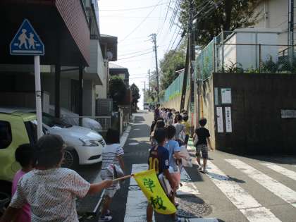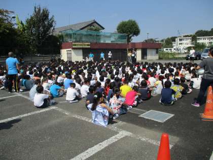 10月2日、避難訓練を行いました。家庭科室から火が出たという想定で、校庭に集まった後、第2次避難場所である妙法寺の駐車場へ避難しました。全訓練を終えて学校に戻るまで、おしゃべりの声は全く聞こえてきませんでした。きちんとやるときはやるという態度が立派でした。