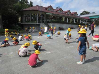午後から、1年生は、入り口近くの広場で、地面いっぱいに絵を書きました。はじめは小さかった絵も、だんだん大きくなり、ダイナミックになりましたよ。