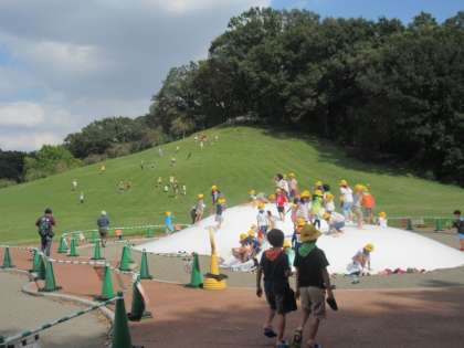 2年生は少し歩いて、牛舎の近くにあるモーモードームで遊びました。まるで、トランポリンのようです。大きな芝生の斜面もあり、元気に遊びました。