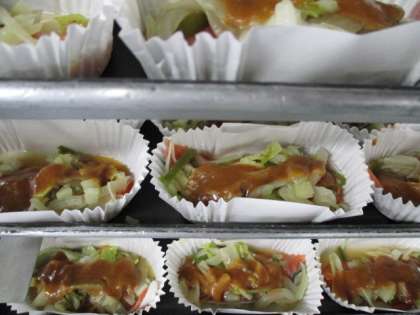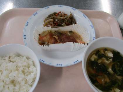「鮭のちゃんちゃん焼き」は北海道の郷土料理です。生鮭の上に、キャベツ、たまねぎ、ピーマンをのせ、うえからバター、みそ、さとう、みりん、しょうゆでつくったみそだれをかけて、オーブンで焼いてつくりました。写真は焼く前の鮭のちゃんちゃん焼きです。