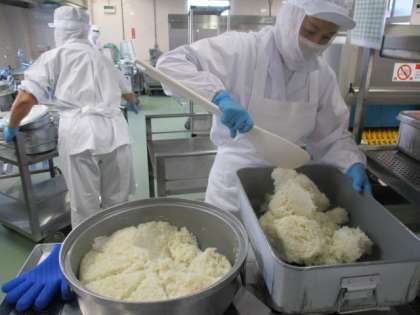 生揚げのそぼろあんかけは、生揚げをだし汁、しょうゆ、さとうで煮含めて、上からしょうが、鶏ひき肉、たまねぎ、にんじん、しいたけ、しめじでつくったそぼろあんをかけています。とても優しい味の和食です。写真はごはんを配缶しているところです。10月から給食のお米はあきたこまちの新米を使用しています。