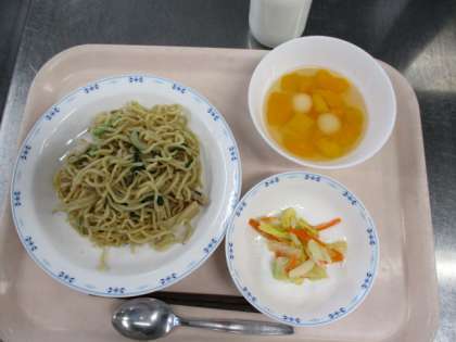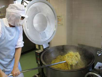 今日はこどもたちに人気のある塩焼きそばです。写真は塩焼きそばを作っている様子です。