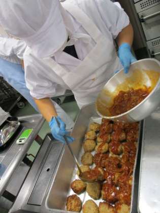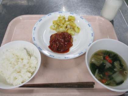 今日はお豆腐をいれた、豆腐ハンバーグです。肉は食べすぎになりがちですが、豆腐を入れることで栄養もアップし、肉の量を減らすことができます。豆腐のおかげで、やわらかく食べやすいハンバーグになりました。写真は玉ねぎ、マッシュルーム、ケチャップ、とんかつソースで作ったソースをかけているところです。