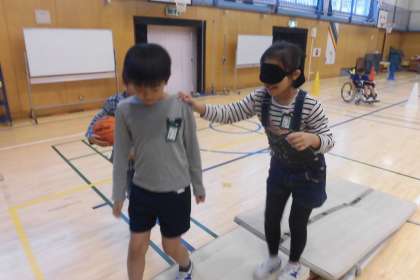 10月25日(金)、4年生は総合「みんながくらしている私たちの町」の学習で福祉体験を行いました。社会福祉協議会と社会福祉法人南山会の皆様にお越しいただき、ブラインドウォークと車いすの体験をしました。ブラインドウォークでは、目の見えない怖さと介助することの大変さを、そして車いす体験では車いすの操作方法と介助方法をそれぞれ学びました。この体験を踏まえ、今後の学習では、自分たちに出来ることや身の回りにある福祉について考えていきます。
