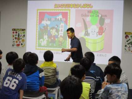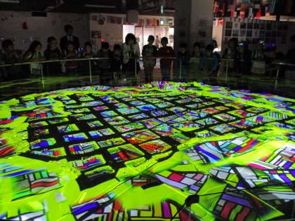 タッチザワールドでは、まず、プロジェクションマッピングで映し出された世田谷区の紹介を見ました。最新機器による見事な映像に子どもたちは釘付けでした。その次は、英語の読み聞かせです。