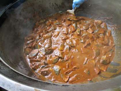 今日のさばのみそ煮は、給食室の大きな鍋でことことと、煮てつくりました。味がしみてとてもおいしくできました。写真は釜でさばを煮ている様子です。