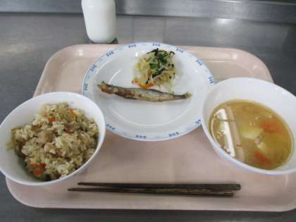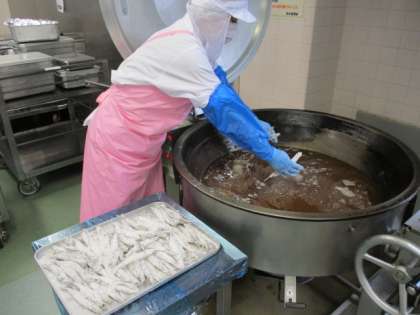 今日のししゃもは片栗粉をつけて、唐揚げにしました。ししゃものように、骨までまるごと食べられる小魚を食べて丈夫な骨を作ってもらいたいと思います。写真はししゃもを揚げている様子です。