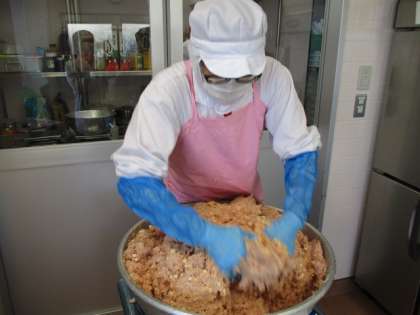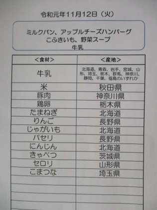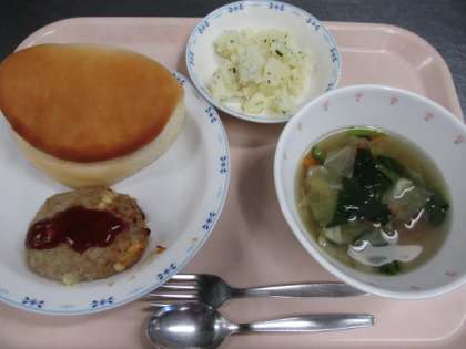今日の主菜はハンバーグの中にりんごと角切りチーズが入った「アップルチーズハンバーグ」です。ふっくらジューシー、とてもおいしくできました。写真はハンバーグのたねをこねているところです。「おいしくな〜れ」と心をこめてこねています。