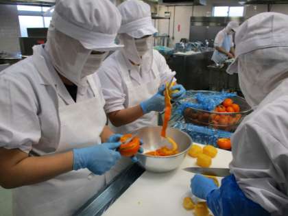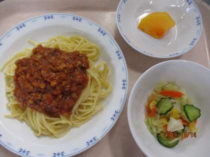 今日はレンズ豆の入ったミートソーススパゲッティです。ミートソーススパゲッティは安定の人気メニューです。くだものは今が旬の柿です。ひとつずつ、皮をむきます。写真は柿の皮をむいている様子です。