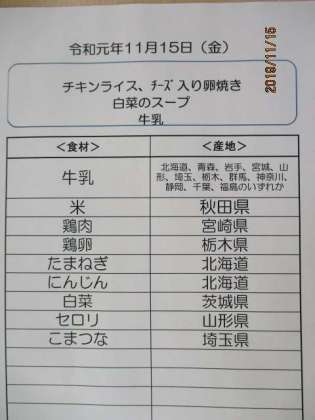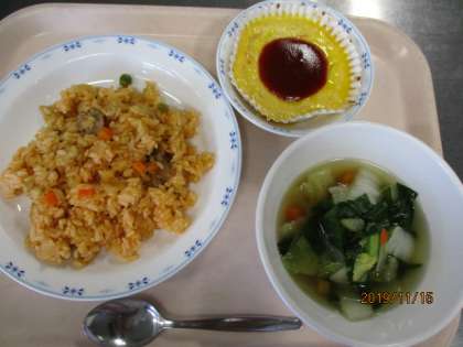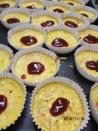 今日の給食はチキンライス、チーズ入り卵焼き、白菜のスープです。写真は配缶前のチーズ入り卵焼きです。焼きあがった後に、ひとつひとつケチャップとソースを合わせたものをかけています