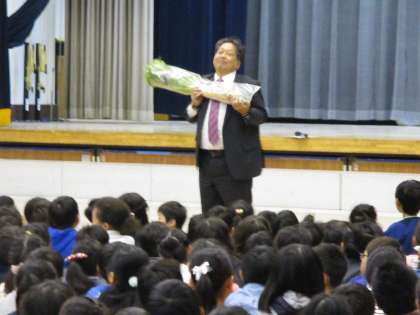 大蔵大根について校長先生から子どもたちへのお話の様子です。
