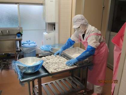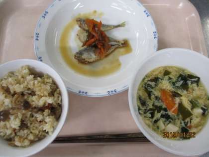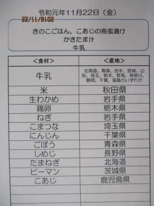 ごはんは秋を感じるきのこご飯です。汁物はかきたま汁です。学芸会の練習で冷えた体を温かい汁物で温めてほしいです。写真はこあじに片栗粉をつけている様子です。