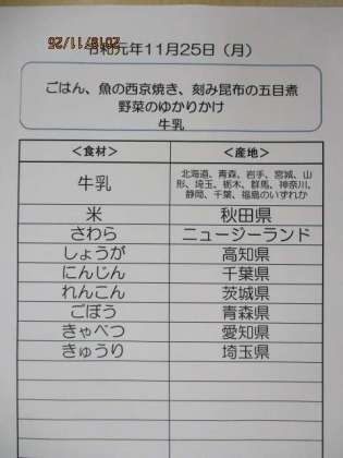 11月24日は「和食の日」です。日本型食生活が長生きによいとされています。日本型食生活とは、ごはんを中心に魚、肉、牛乳、乳製品、野菜、海藻、豆類、果物、茶などのたくさんの食品を組み合わせた食生活のことです。給食でも和食の献立の日を多くするようにしています。