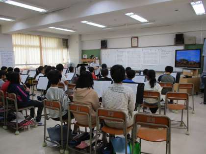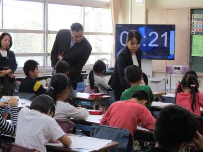 11月20日、砧の学び舎合同研修会がありました。4校の教員が教科ごとに分かれ、授業力向上のため研究授業を行います。本校は国語、音楽、算数の会場となりました。写真は、佐柳教諭による3年2組の国語と、伊關教諭による5年1組音楽の様子です。