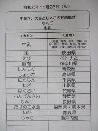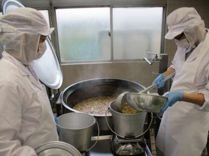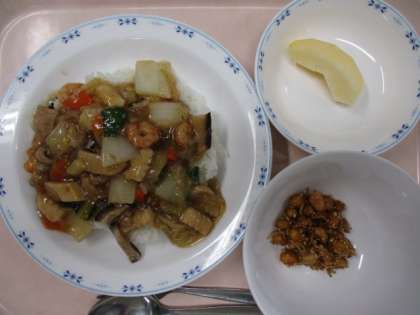 大豆とじゃこの甘辛揚げは給食でもとても人気のある献立です。写真は中華丼のあんをクラスの食缶へ入れているところです。必要な量を正しく配れるように、ハカリに乗せて、一クラスずつ計量しています。
