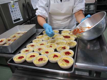 今日はスペイン風オムレツです。スペインでは「トルティージャ」という名前で呼ばれています。写真は焼きあがったオムレツにケチャップと赤ワインで作ったソースをかけているところです。
