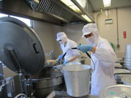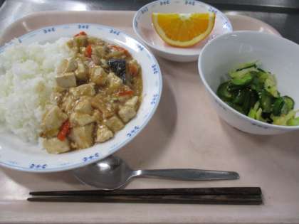 今日は中国の家庭料理「家常豆腐」ジャージャンドウフです。写真はジャージャンどうふを配っている様子です。
