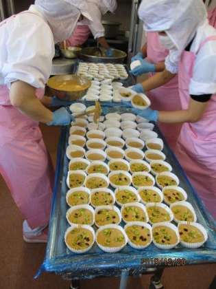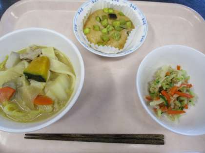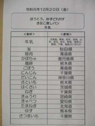 今年の冬至は12月22日日曜日です。冬至の日当日は給食がないので、今日を冬至の行事食にしました。冬至の日に、かぼちゃを食べたり、ゆず湯に入ったりするとかぜをひかいないといわれています。今日はほうとうでかぼちゃ、ゆずドレサラダでゆずを使いました。ほうとうは山梨県の郷土料理です。写真はきなこ蒸しパンを作っている様子です。きなこがはいった蒸しパンの上にさつまいもをのせています。