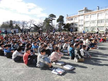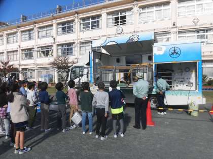 校庭に避難した後は、4〜6年生までのクラスの代表者が起震車を体験しました。