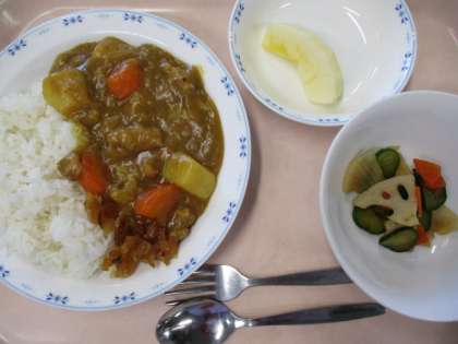 3学期の給食が始まりました。最初の給食はこどもたちが大好きなカレーライスです。教室をのぞくと、カレーのおかわりにたくさんのこどもたちが並んでいました。「おいしかったです!」と言ってもらえるととてもうれしいです。3学期も安全でおいしい給食を作っていきます。