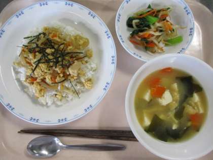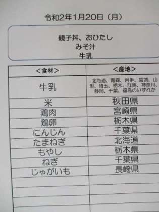 今日は親子丼です。給食の親子丼は卵にしっかりと火が通っているので、安心して食べられます。給食室でとったかつおだしとたっぷりのたまねぎが入っていて、とてもおいしい親子丼です。給食の親子どんには糸こんにゃくも入っているんですよ。