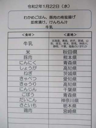 今日の主菜は豚肉の南蛮揚げです。豚もも肉をねぎとニンニクが入ったたれに漬けてから小麦粉をつけて揚げました。お肉に厚みがあり、外はカリッと中は柔らかく仕上がりました。汁物はけんちん汁にしました。寒い冬は具たくさんのあたたかい汁ものを食べて体を温めましょう。