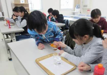専用の帽子もかぶり、清潔感を感じました。ここでは、油汚れを落とす仕組みについて実験をしました。