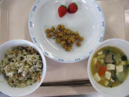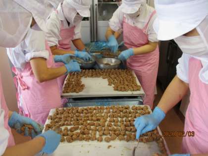 今日は節分の行事食です。大豆といわしをつかった献立にしました。節分に煎りり豆を年の数にひとつ足した数を食べると1年を元気にすごすことができるといわれています。写真はいわしのつみれ汁にいれるつみれを作っているところです。