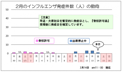 昨日、体調不良(37度前後)で早退後、熱が高くなってきたとの報告が2件ありました。ともに今朝医療機関を受診したところインフルエンザB型であったと学校に連絡が入りました。