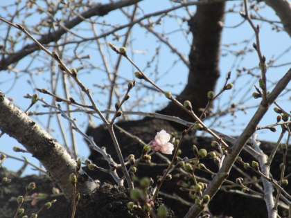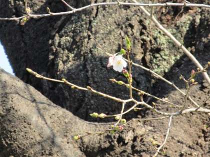 3/18 百年桜が開花しました。小さな花ですが、春はもうすぐです。
