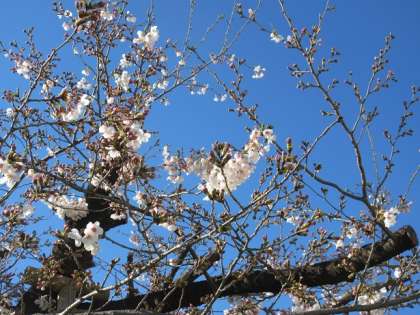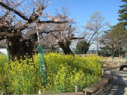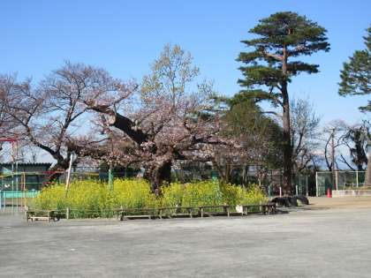 今日は卒業式でした。青い空と黄色い菜の花の間に咲く百年桜。