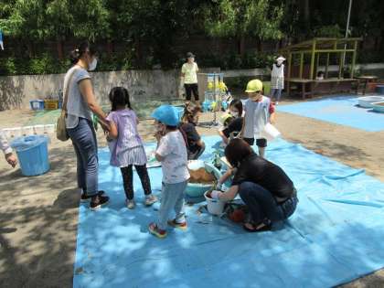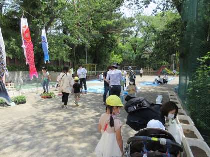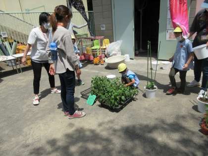 年長さんは、毎年この時期に、インゲンやピーマンなどの夏野菜の栽培を始めています。今年は休園になっているので、植えた苗を鉢ごと持ち帰り、各家庭で育てることにしました。